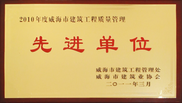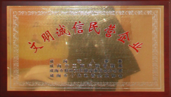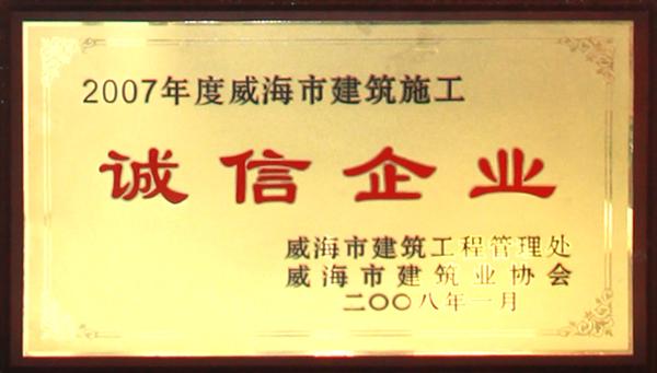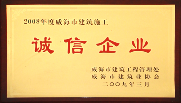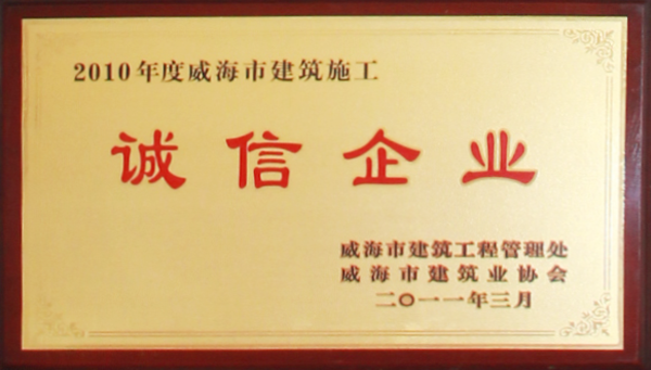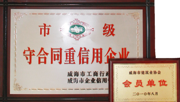 公司連續(xù)八年榮獲威海市“誠(chéng)信開發(fā)企業(yè)”、“建筑施工誠(chéng)信企業(yè)”,連續(xù)九年被評(píng)為威海市級(jí)“守合同重信用企業(yè)”,多次被評(píng)為威海市“市級(jí)文明單位”、“質(zhì)量管理先進(jìn)企業(yè)”、 “安全管理先進(jìn)企業(yè)”,乳山市“優(yōu)秀企業(yè)”、“先進(jìn)民營(yíng)企業(yè)”、“納稅明星企業(yè)”,在社會(huì)上逐步樹立了誠(chéng)信、穩(wěn)健的企業(yè)形象。